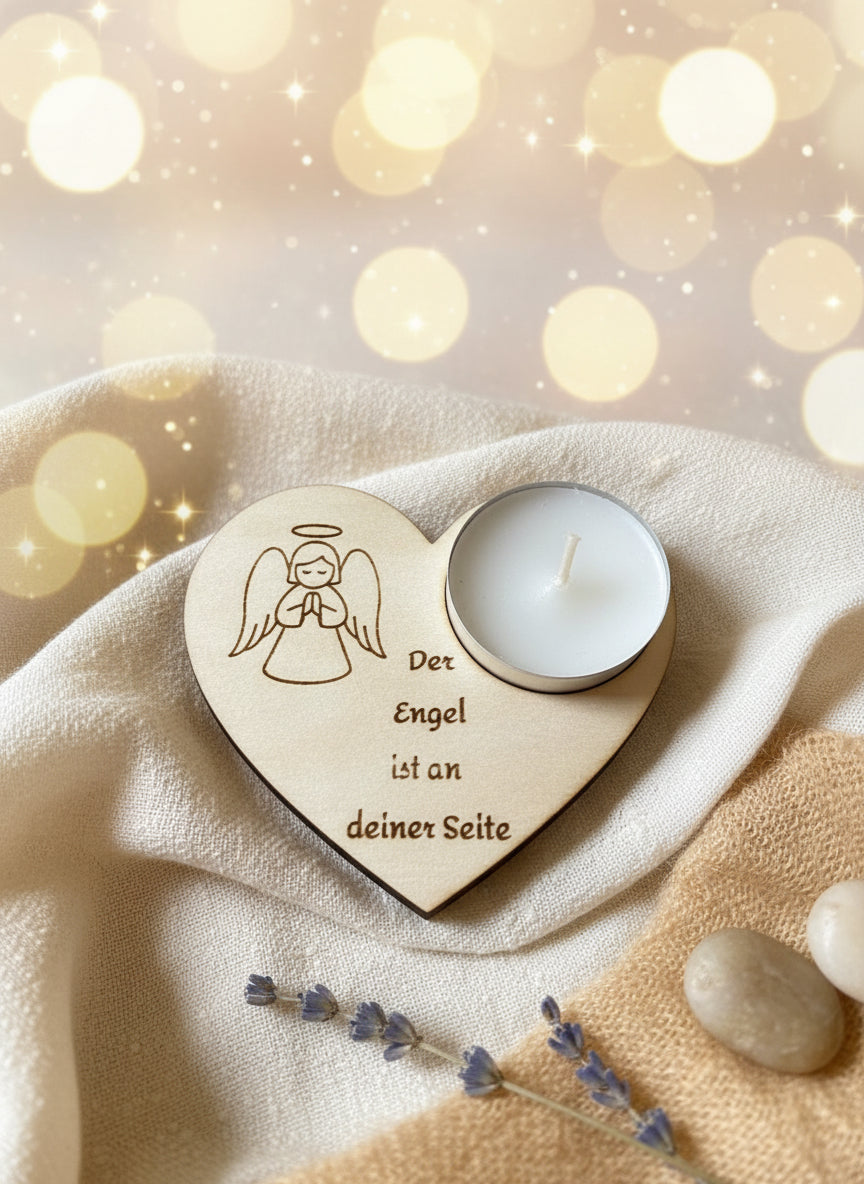 Dieses herzförmige Teelicht mit filigraner Engelsgravur schenkt Wärme, Trost und ein Gefühl von Geborgenheit. Mit der liebevollen Botschaft „Der Engel ist an deiner Seite“ ist es ein besonderes Licht für jeden, der ein wenig Hoffnung und Nähe braucht.